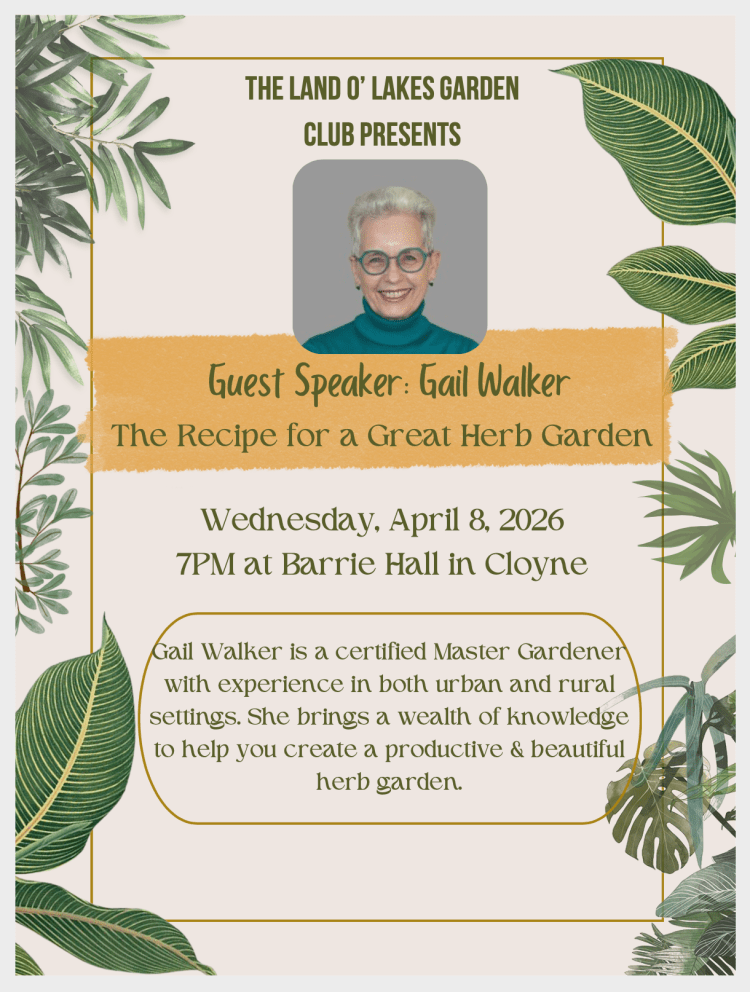 Our speaker for our April meeting will be Master Gardener, Gail Walker. Gail will talk to us about The Recipe for a Great Herb Garden.