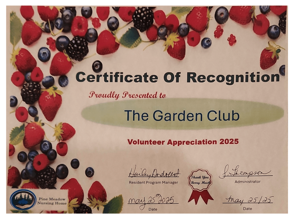 The Pine Meadow Nursing Home is so appreciative of the work we do there every year including the Spring and Fall Cleanups and planting colourful annuals in their many beds, planters and barrels. These beautiful displays are a credit to those who help out each year and are enjoyed by the residents, their families and the staff.