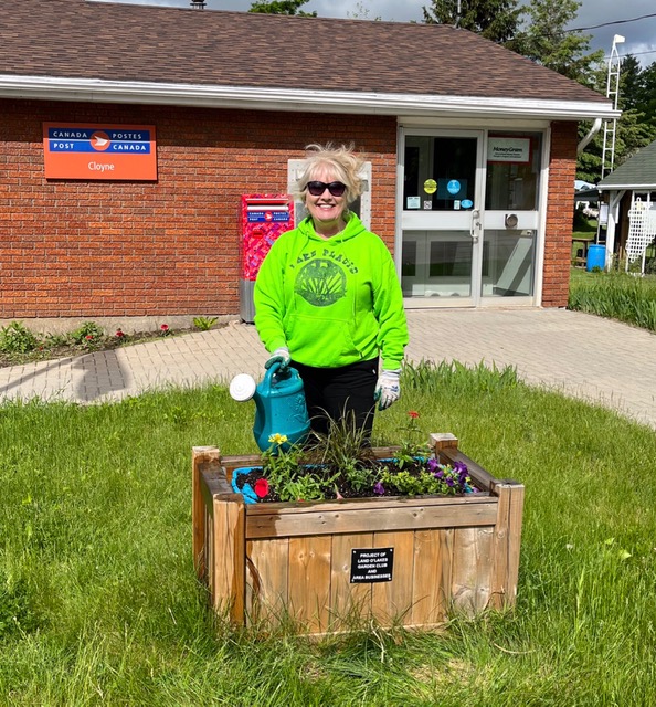 Shirley Miller has been watering and tending the planter box at Tapping’s Landing on Lake Mazinaw for about 13 years on her daily 7 km walks along the North Mazinaw Lake Road.