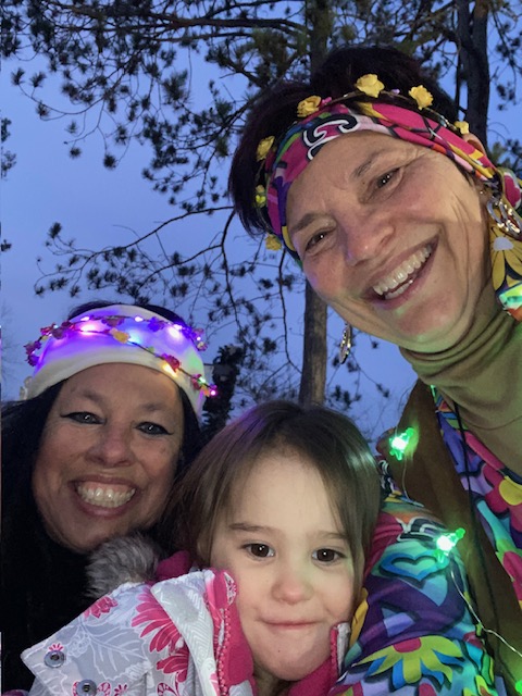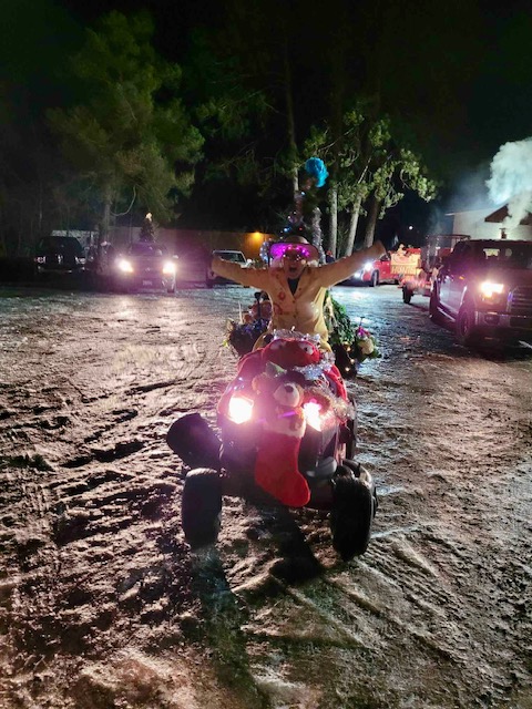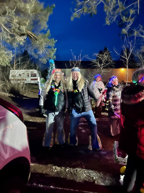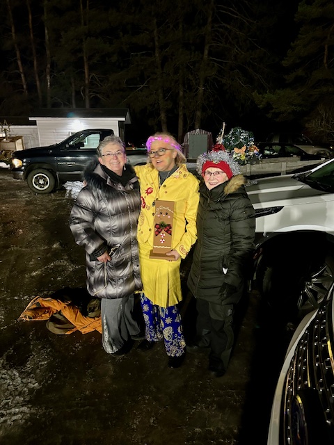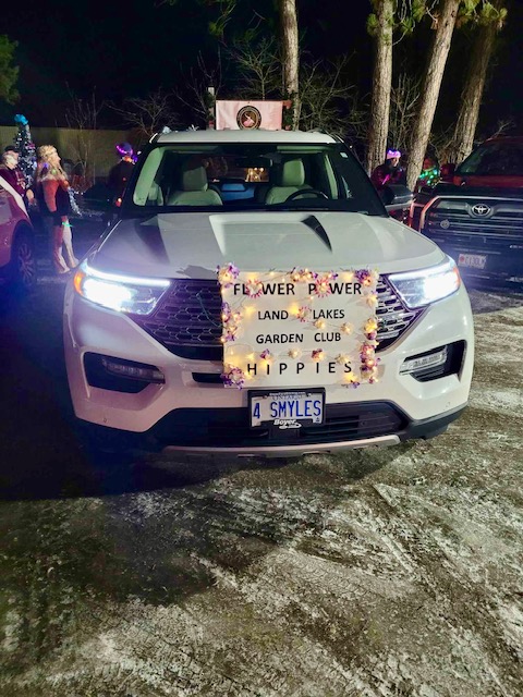 The Elves got together again for the 2023 Lions Santa Clause Night Time Parade and our theme was “Flower Power” – very apropos for a Garden Club! We dressed up as hippies, had a magnificent float with our favorite princess on her sparkling throne and we even had an add-on – a festively decorated lawnmower! We handed out candy to the kids and gave corsages that we had made to Pine Meadow, so they could give them to their residents, their families and the staff.