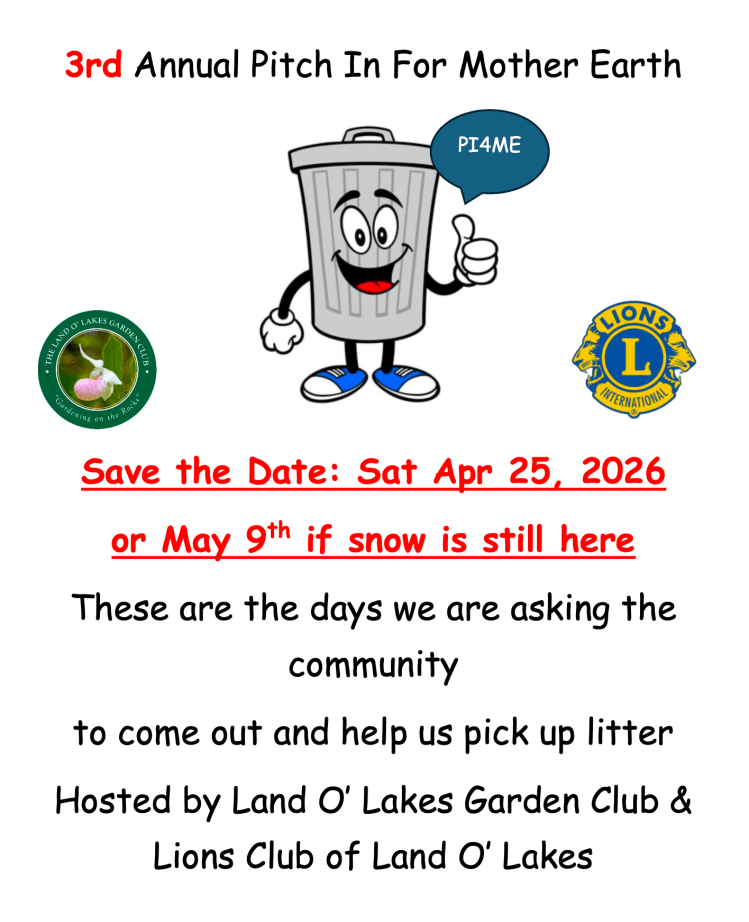 Each year we team up with the Lions of Land O’ Lakes to get as many people as possible to come out and help pick up litter from our roadsides and ditches. 2024 was our first year and we had great success. Our date for 2026 will be Saturday, April 25th and we will be posting information on our Facebook page with all the details volunteers need to pick up litter safely.
