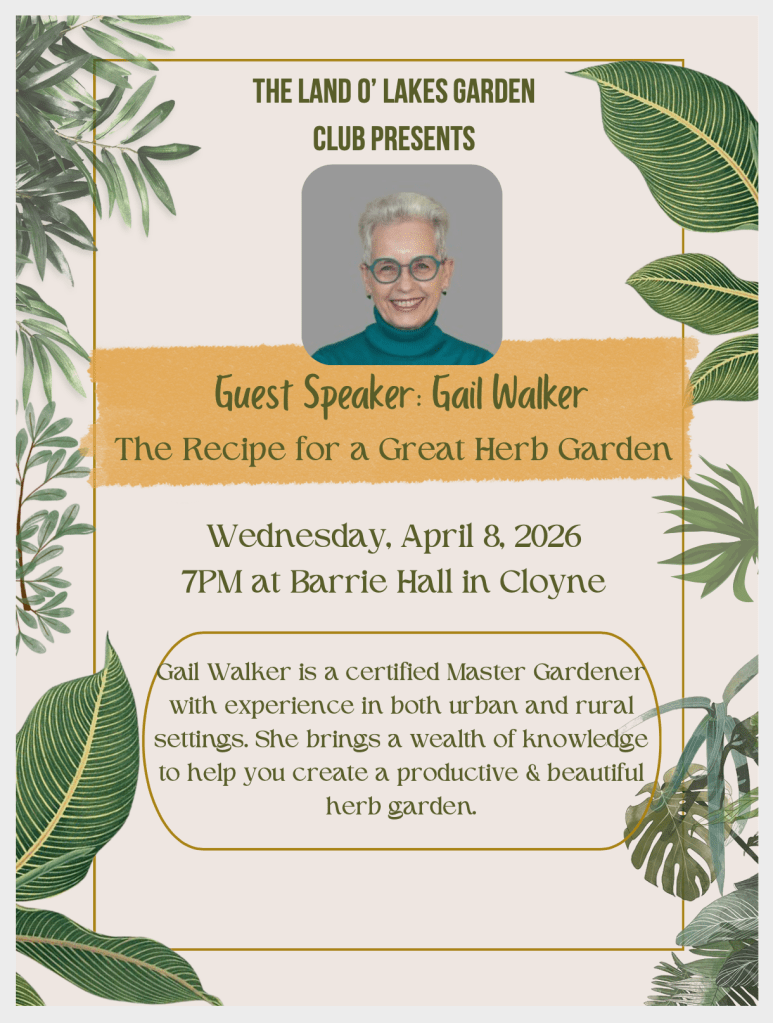 Wednesday, April 8, 2026 A return visit from Master Gardener, Gail Walker. Gail will talk to us about Herbs. Partager :TweetLike Loading...